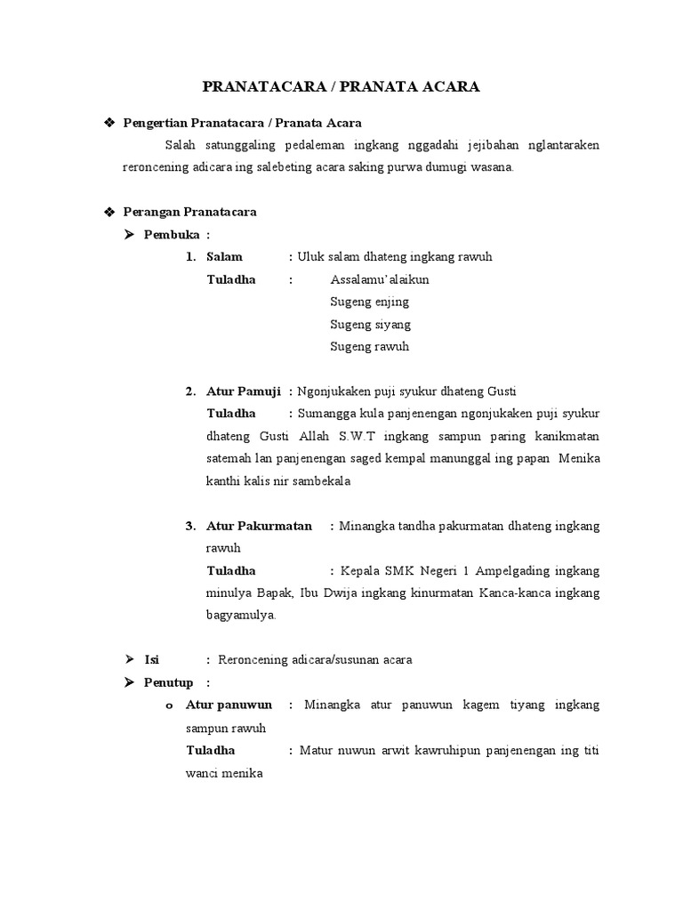 Mutiara wicara jawa pandom pranatacara lan pamedharsabda center. Regeng, nges lan orane sawijining adicara iku dadi tanggungjawabe pranatacara. Contoh teks negosiasi jual beli dan strukturnya. Contoh teks pranatacara adicoro pengantin bahasa jawa muda mudi. Dilengkapi contoh gendhing dan terjemah bahasa indonesia. Dalam kamus besar bahasa indonesia (kbbi), struktur diartikan sebagai sesuatu disusun atau dibangun. Pengertian, ciri ciri, jenis jenis, unsur kebahasaan, dan struktur teks biografi. Kula minangka pranatacara ing siyang menika kathah pinanggih kalepatan ing basa lan subasita, kula nyuwun agunging pangapunten. Bab bab sing kudu digatekake nalika nulis adicara. Analisis kesalahan diksi pada naskah pidato bahasa jawa. Struktur penting dalam sebuah teks karena menjadi pola atau kerangka yang memudahkan pembaca memahami tulisan dengan logis. Suatu hari ada seorang siswa sekolah menengah pertama pergi ke toko buku bekas. Yang pertama adalah bagian tujuan, kedua material bahasan dan yang.